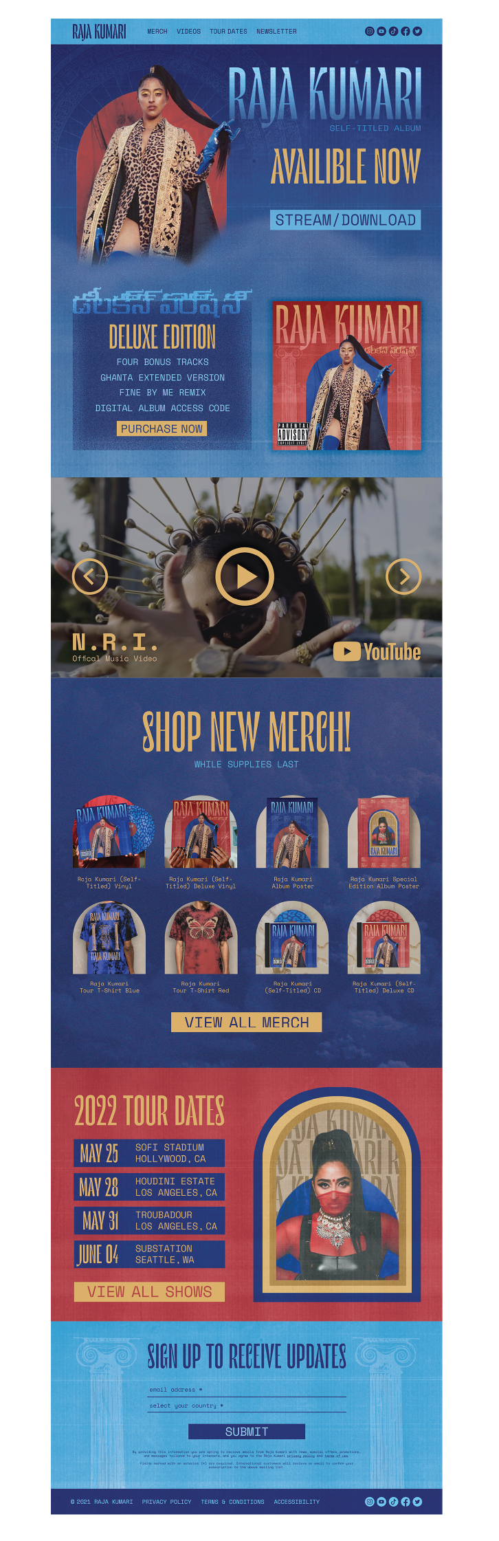 Architectural forms echo the duality of her cultural identity, while red and blue anchor the visuals—drawing from both Hindu symbolism and American influence. The result is bold, intentional, and rooted in contrast—like her music.